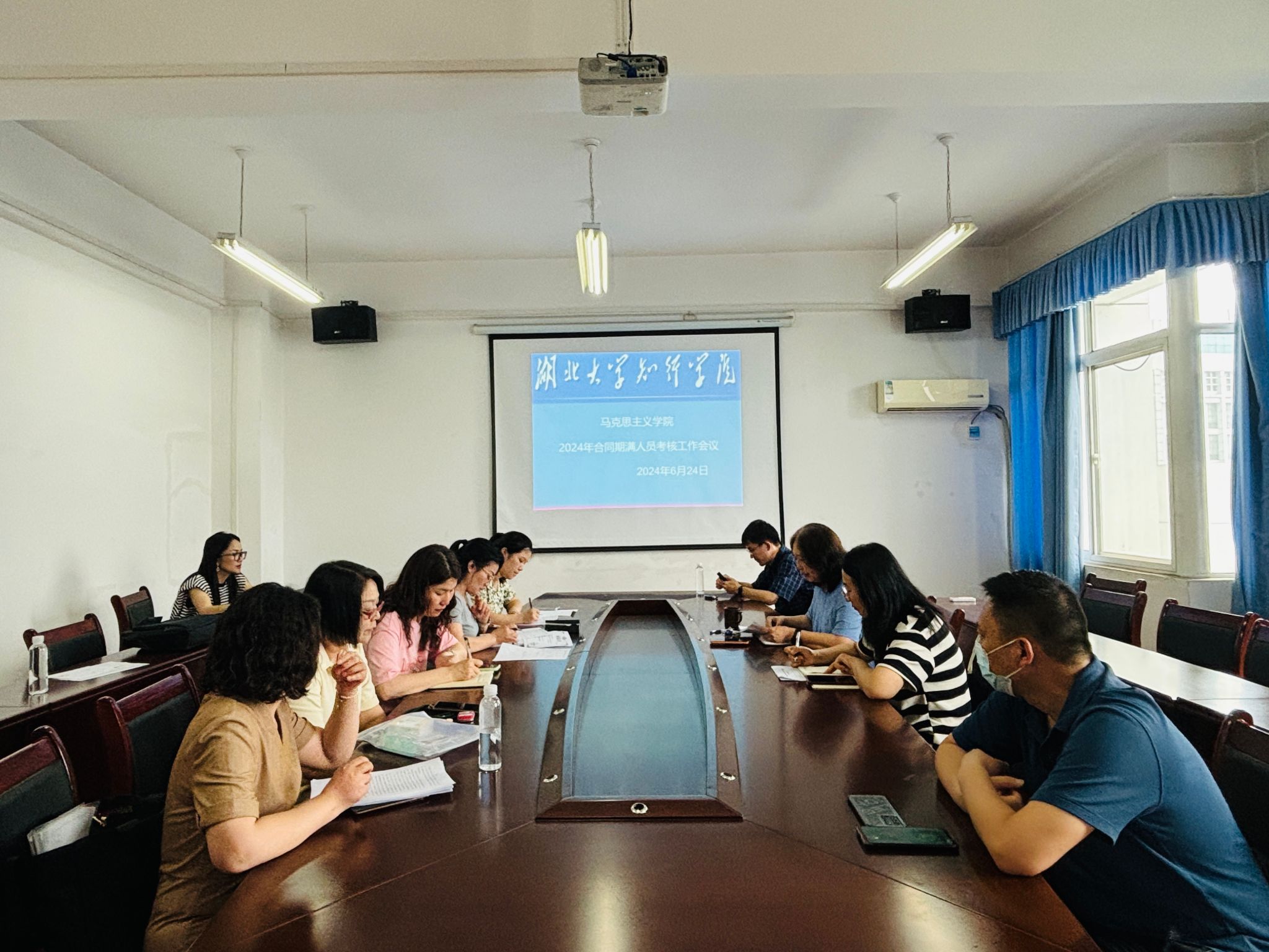会上,杨院长首先组织全体教师学习了2024年合同期满人员考核工作的文件,着重强调此次考核原则,接着合同期满教职工向全体成员汇报本聘期内思想政治、教育教学、公共服务、科研等情况,再由参会的教职工对两位位老师进行民主测评,民主测评结果均为合格。再由人力资源部代表李晓亚老师同本院不少于50%的教职工对合同期满的两位同志在德、能、勤、绩、廉等五个方面的表现进行了个别座谈,根据民主测评结果及个人续聘意愿,院考核领导小组集体讨论,认为李华琼老师、张清老师圆满完成了本聘期的工作任务,表现合格,初步同意李华琼老师,张清老师续聘,并报学校考核领导小组审核。