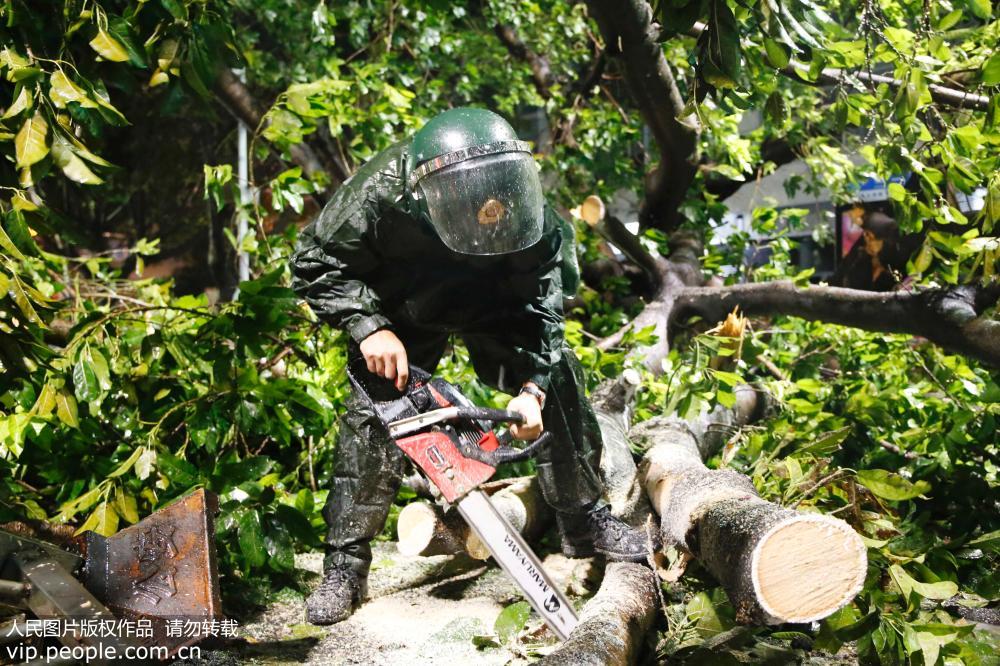 9月16日23时,武警中山支队官兵闻令而动,分3个梯队出动200余人次,携带油锯、砍刀、铁锹、救援绳索等装备前往受灾区域顶风冒雨展开救援。受灾现场,官兵挥汗如雨,紧张的清理障碍,他们顾不上吃饭喝水,心里只想着早点清理障碍,减少次生灾害,确保群众安全出行;官兵们累了就席地而坐稍作休息,有的官兵还被树枝刮伤,鲜血直流,但都无一人退缩,个个轻伤不下火线,仍然战斗在救援一线。