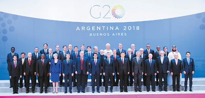 当地时间十一月三十日,二十国集团领导人第十三次峰会在阿根廷布宜诺斯艾利斯举行。国家主席习近平出席第一阶段会议并发表题为《登高望远,牢牢把握世界经济正确方向》的重要讲话。这是习近平同其他与会领导人合影。