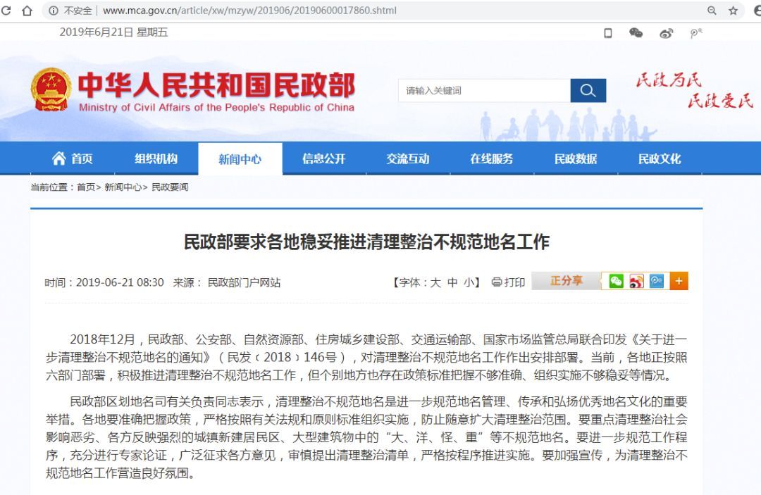 据民政部网站21日消息,民政部要求各地稳妥推进清理整治不规范地名工作。