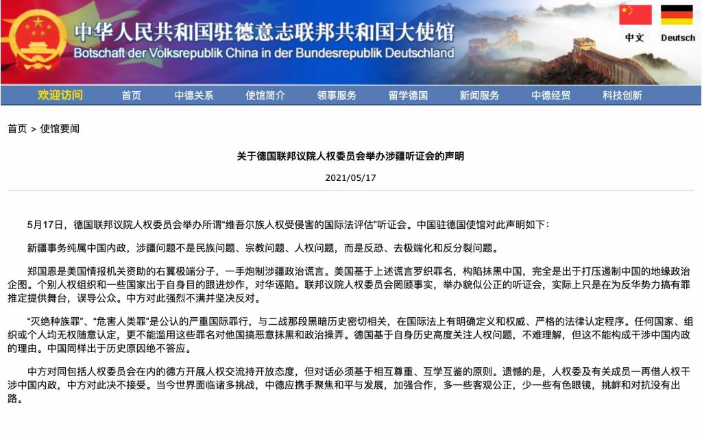 据中国驻德国使馆网站消息,5月17日,德国联邦议院人权委员会举办所谓“维吾尔族人权受侵害的国际法评估”听证会。中国驻德国使馆对此声明如下: