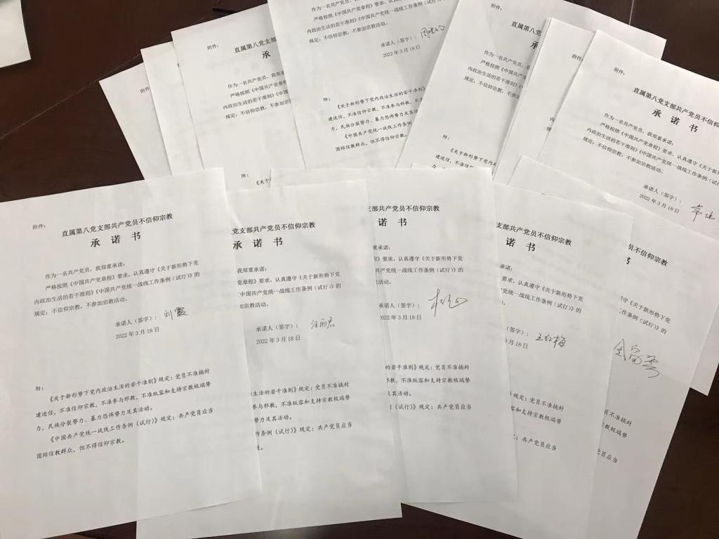 会后,直属第八党支部全体党员签订了《直属第八党支部共产党员不信仰宗教承诺书》,纷纷表示今后在工作中要积极发挥先锋模范作用,扎实开展反邪教工作,生活上带头参加健康有益的文体活动,传播科学文化知识,倡导社会文明新风,必须围绕党的中心工作发挥意识形态的能动作用,营造风清气正、平安和谐的工作环境。