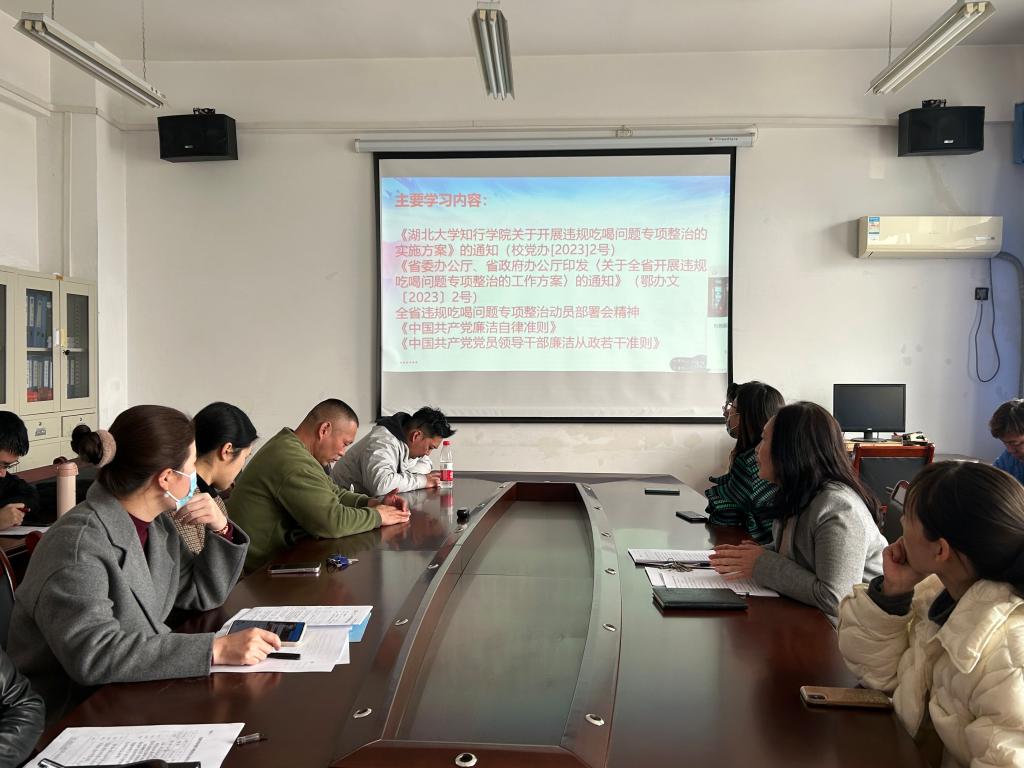 会议开始,杨书记集中传达学习了二十大和中央八项规定精神,二十届中央纪委二次全会精神、全省违规吃喝问题专项整治动员部署会议精神以及关于开展违规吃喝问题专项整治有关文件精神。重点带领大家学习了《OK138太阳集团关于开展违规吃喝问题专项整治的实施方案》的通知(校党办[2023]2号)内容、《中国共产党廉洁自律准则》、《中国共产党纪律处分条例》等相关条文。她要求全体参会人员要围绕文件中的相关条文开展自学,撰写心得体会,进行违规吃喝问题专项整治谈心谈话并填写谈话记录。