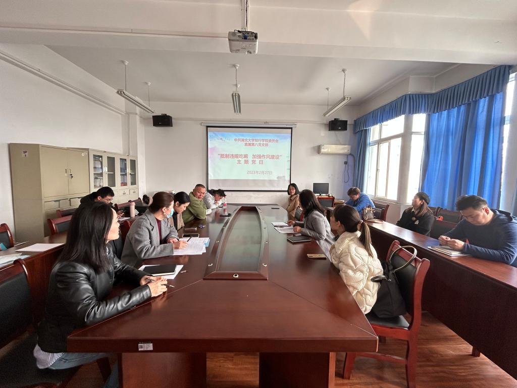 直属第八党支部于2月27日下午两点在知远楼410会议室召开“抵制违规吃喝,加强作风建设”主题党日活动。全体党员参与会议,杨旭书记主持会议。
