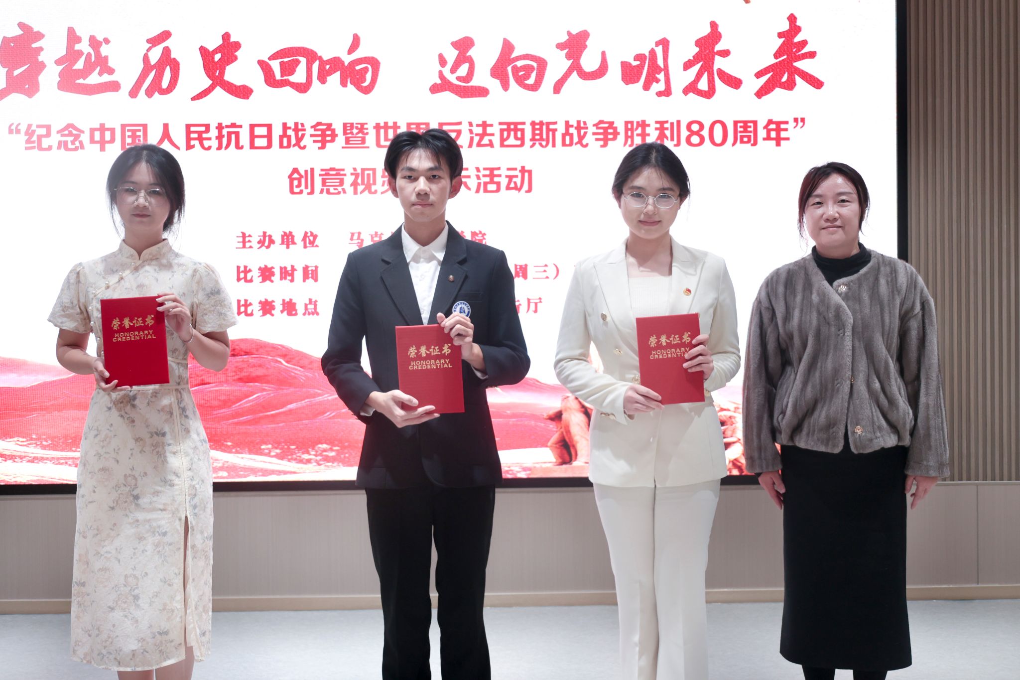 为深刻铭记中国人民抗日战争暨世界反法西斯战争胜利的伟大历史,大力弘扬爱国主义精神与伟大抗战精神,11月26日下午,我院主办的“穿越历史回响 迈向光明未来——纪念中国人民抗日战争暨世界反法西斯战争胜利80周年创意视频展示活动”决赛在知远楼202报告厅成功举行。