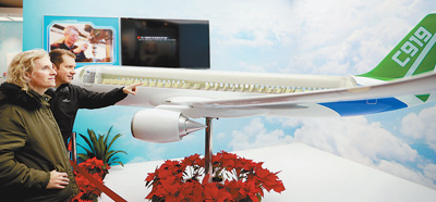 图为日前,外国观众在国产大飞机C919展台前参观。