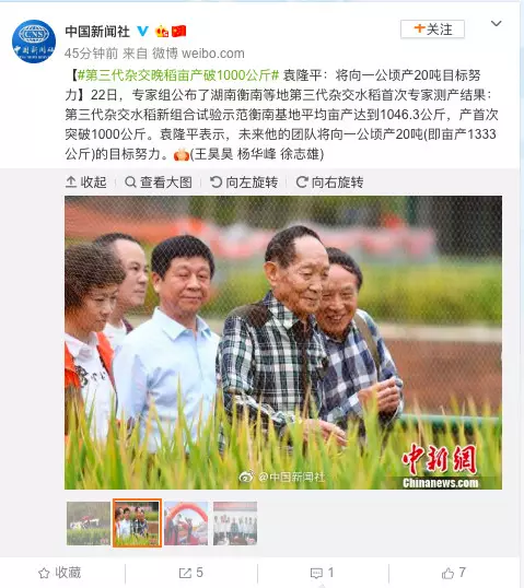 在被问到对此次测产结果是否满意时,袁隆平院士表示:“达到预期,很满意。”袁隆平表示,未来他的团队将向一公顷产20吨(即亩产1333公斤)的目标努力。