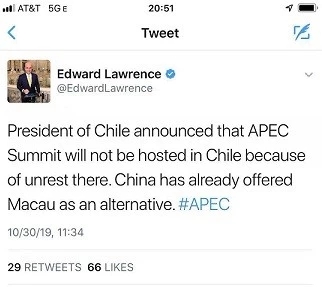 “智利总统宣布因为骚乱不在智利举办APEC峰会,中国提议澳门作为备选。”“中国提议到澳门去签协议”,是真是假?