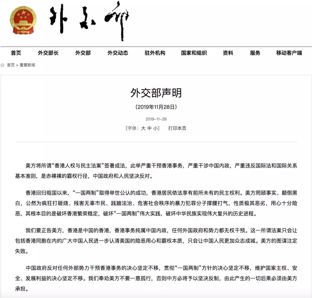 当地时间27日,美方不顾中方的强烈反对,一意孤行,将“香港人权与民主法案”签署成法。28日,外交部、国务院港澳办、香港中联办、香港特区政府、驻港公署接连发声,对美方的恶劣行径表示极大愤慨和最强烈谴责。
