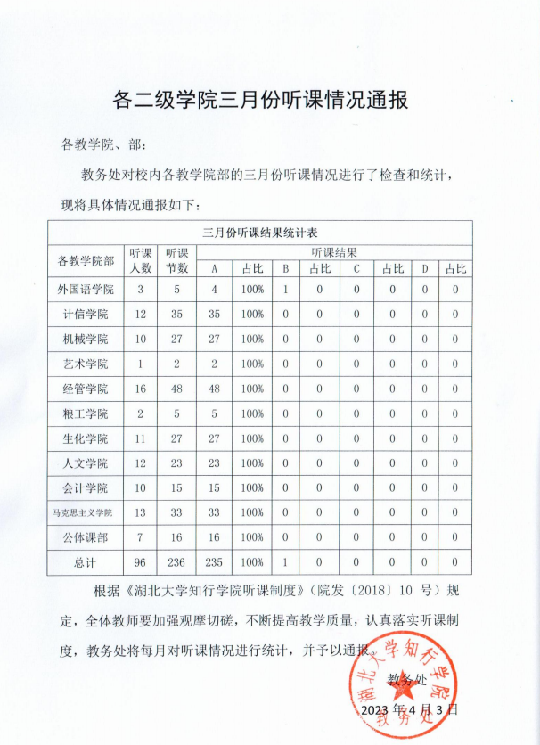 各二级学院三月份听课通报